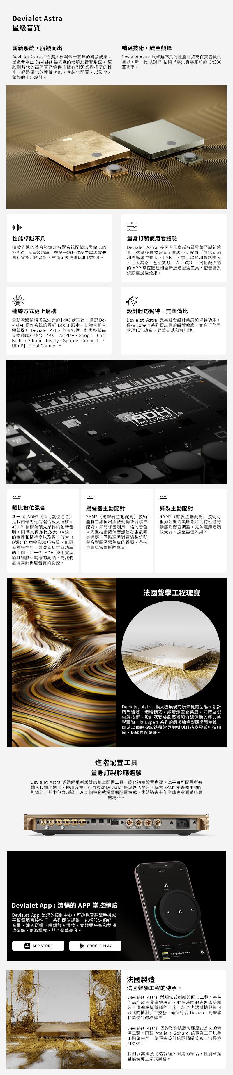 Devialet Astra 是名符其實的整合系統,具備播放影音時所需的核心元素,包括前級放大器、功率放大器、數位類比轉換器、網路播放器和唱頭放大器,全部巧妙融合在纖薄的機身之中。