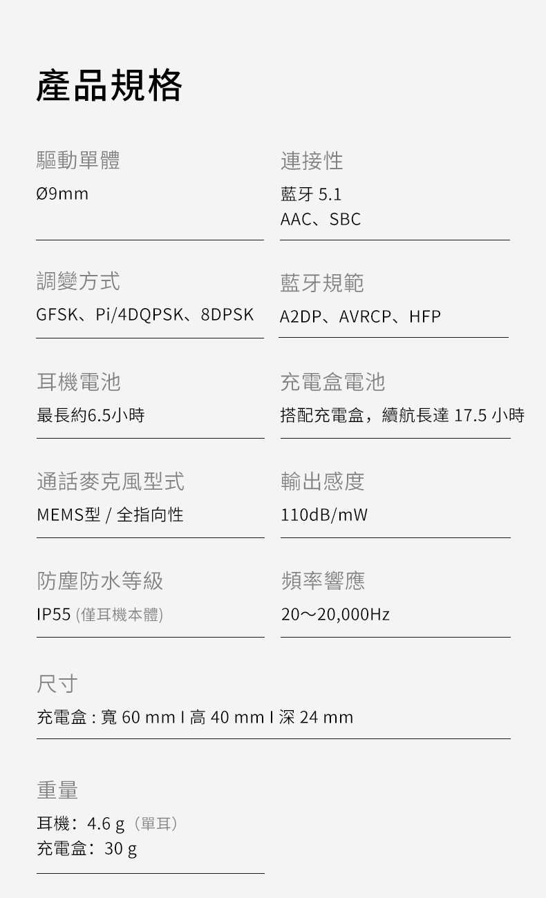 耳機與充電盒滿電時開啟降噪的情況下,耳機本體可連續使⽤約 6.5 ⼩時,搭配充電盒⼀起使⽤則可連續播放約 17.5 ⼩時。關閉降噪功能時,耳機本體播放時長可達 7.5 ⼩時,搭配充電盒⼀起使⽤時則可達 20 ⼩時。 *依據使⽤條件⽽異