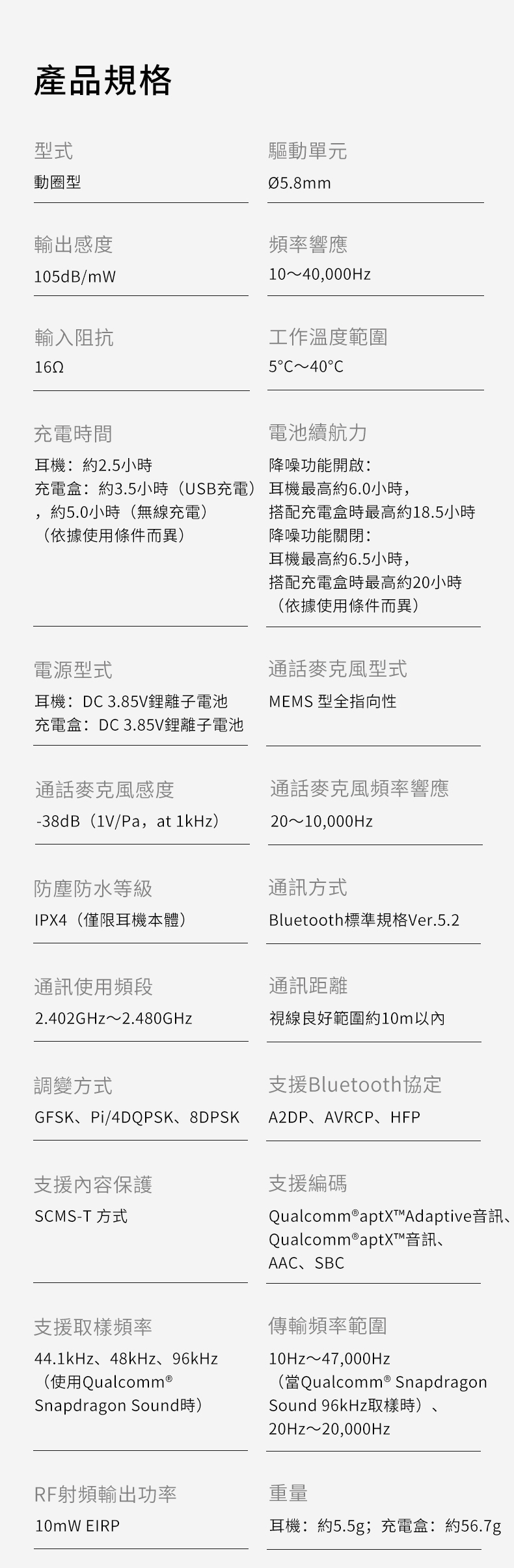 ・aptX™ Adaptive Audio:支援最大 96kHz / 24bit 的高解析度音訊傳輸(A2DP編碼)。不僅限於音樂播放,也能在觀賞影片或遊玩遊戲時,提供廣域動態範圍與高解析度的音效表現。