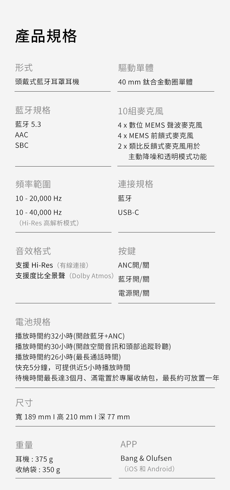 Beoplay H100 提供沉浸式音效和豪華設計,耐久性強,經得起時間的考驗。配備鈦驅動器和先進的杜比全景聲耳機,具有卓越的降噪功能。非常適合音樂、工作和旅行。