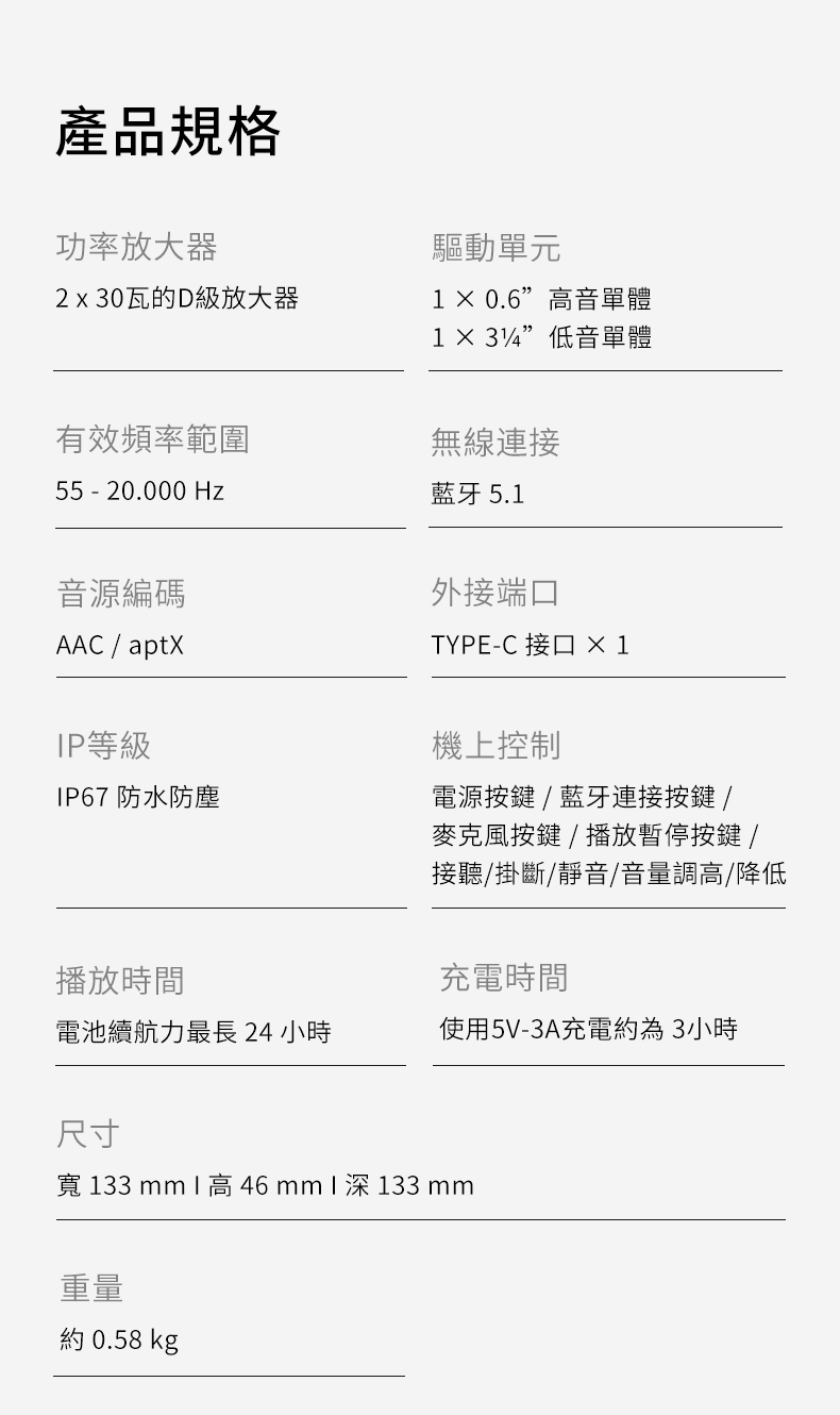 可攜式藍牙揚聲器配備升級版的重低音表現,令人驚艷的 360 度環繞播放和超乎想像的持久續航力。