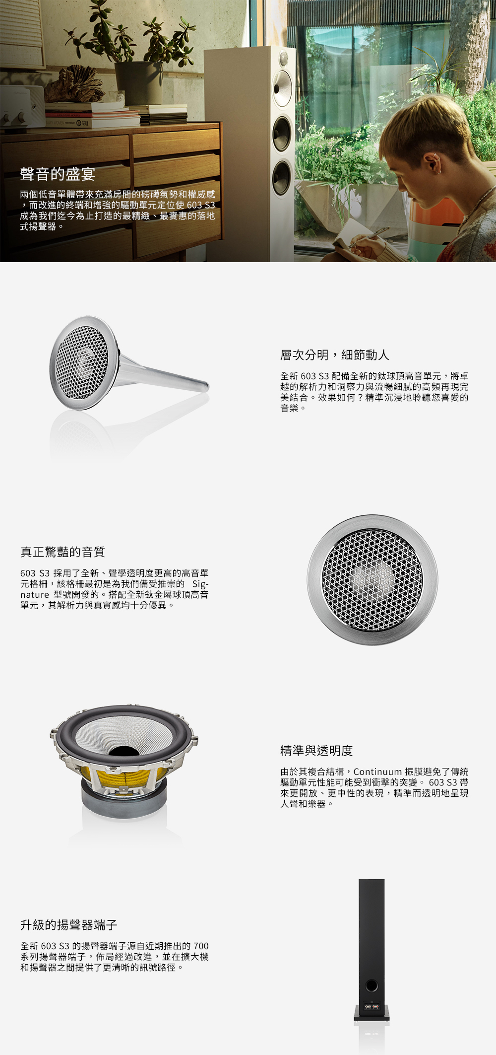 603 S3 是新 600 系列中唯一的落地式揚聲器,主要運用在較大型房間與家庭劇院系統;它結合了我們新研發的鈦高音與準確性與透明度均廣受好評的 Continuum™ 中音單體。