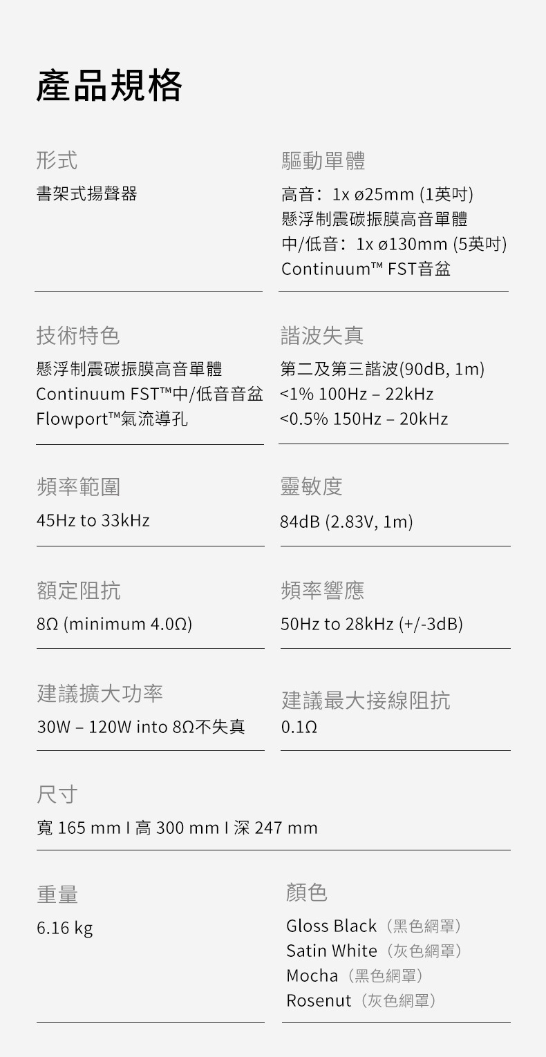 707 S3的空間友好設計使其可以輕鬆容納在較小的空間中,但其懸浮制震碳振膜高音單體與Continuum FST™中/低音音盆搭配弧形障板,這款出色的揚聲器為您帶來極正向的肯定;是的,小尺寸也有大表現。