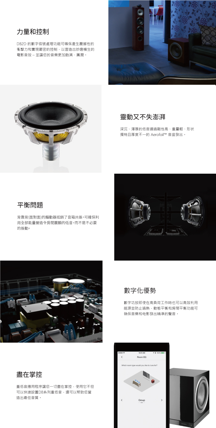 DB2D 採用與旗艦版 800 D3 音響相同的 10 in 驅動器以及高頻 1000 瓦功放,並利用智能 DSP 優化在任何房間中呈現的低音。
