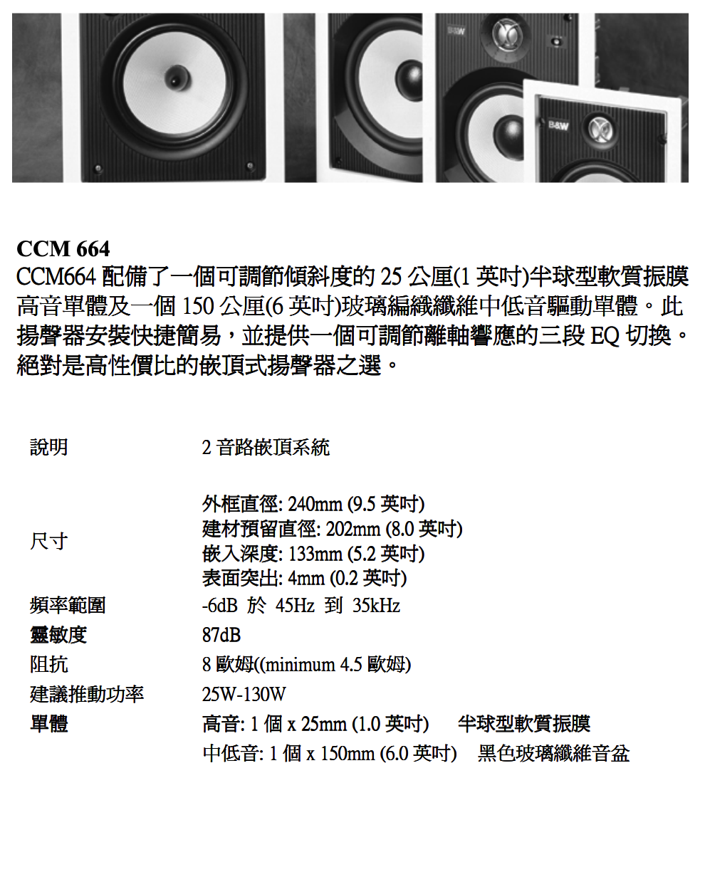 CCM664 配備一個可調式傾斜補償型 25 毫米(1 英寸)軟球頂型高音單體和一個 150 毫米(6 英寸)玻璃纖維編織中低音驅動器。