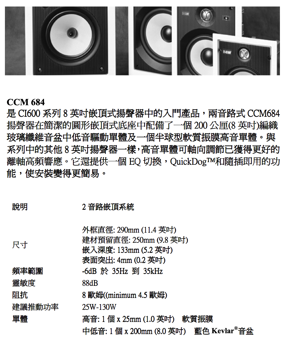 作為 CI600 系列 8 英寸天花板嵌入式揚聲器中的入門產品,二路式 CCM684 揚聲器配備了一個 200 毫米(8 英寸)玻璃纖維編織音盆中低音驅動器及一個軟球頂型高音單體。