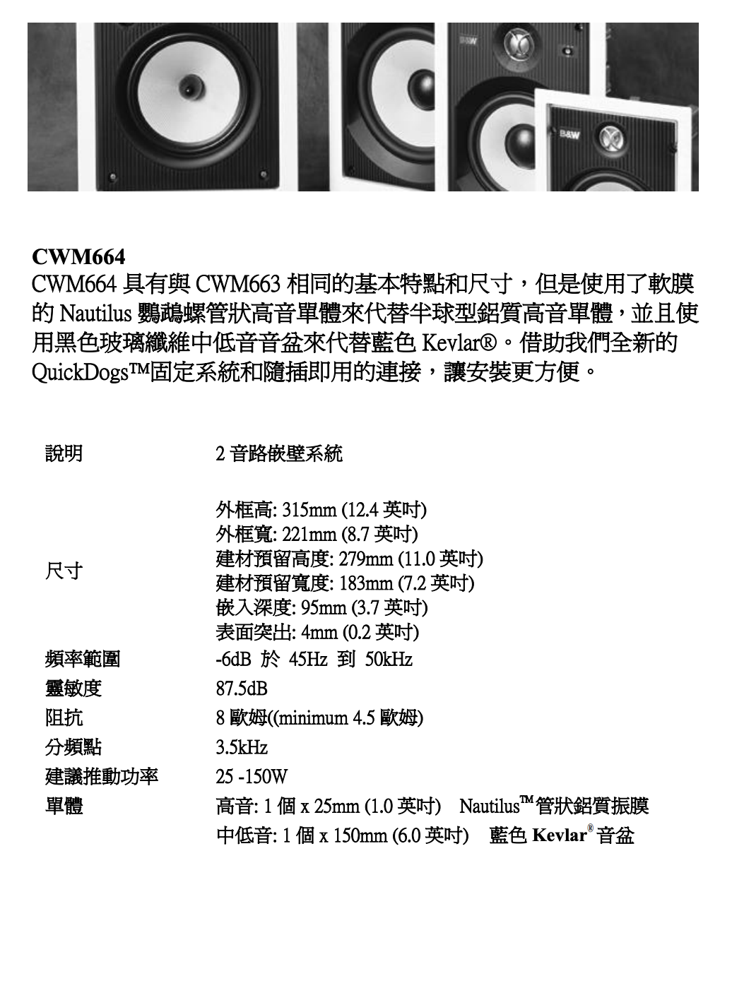 CWM664 具有與 CWM663 相同的基本特點和尺寸,但是使用了 Nautilus(鸚鵡螺)導管式軟球頂型高音單體來代替鋁制球頂型高音單體,