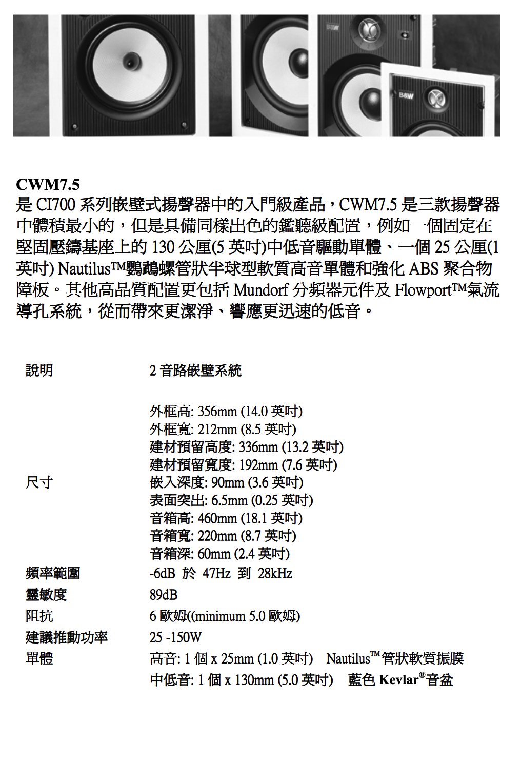 作為 CI700 系列嵌壁式揚聲器中的入門級產品,CWM7.5 是三款揚聲器中體積最小的,但具有同樣出色的監聽級性能。