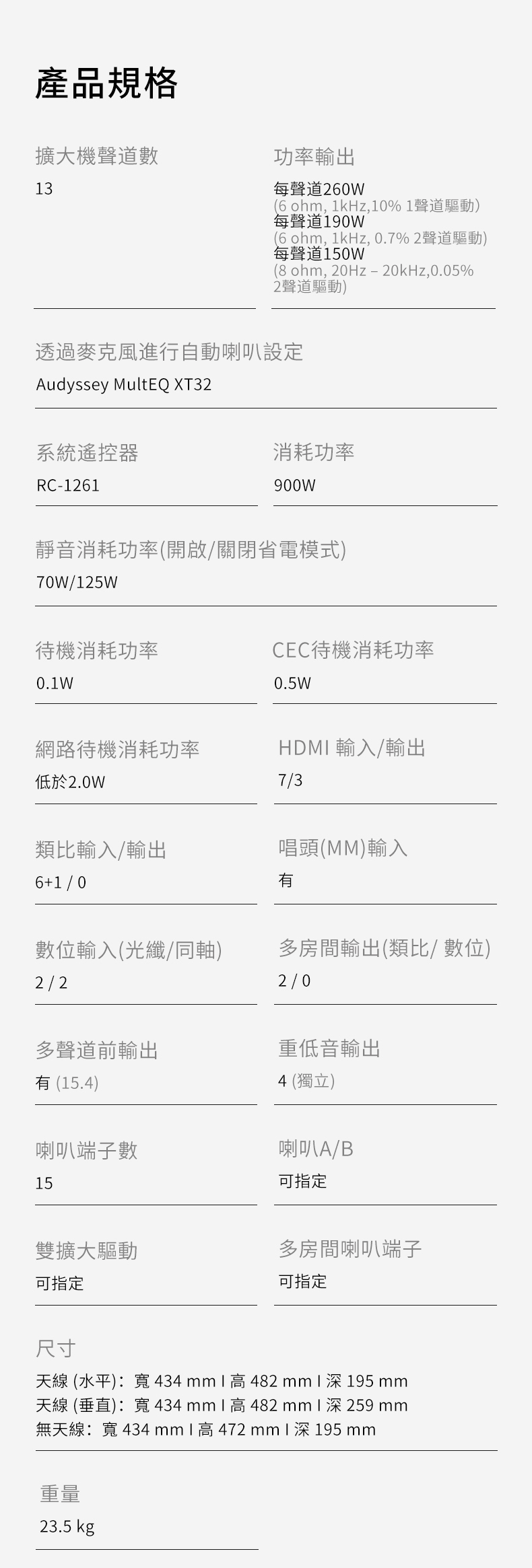■ 每聲道260W (6 ohm, 1kHz,10% 1聲道驅動)