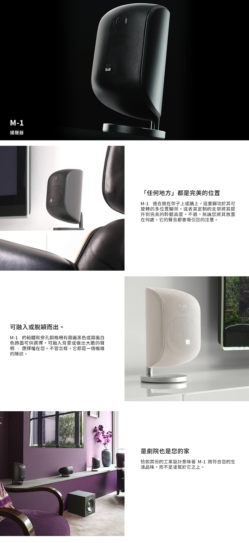 M-1 揚聲器可以獨立使用、與 2.1 系統中的超低音配合使用,或者作為我們屢獲殊榮的家庭影院系統中的一部分進行使用。