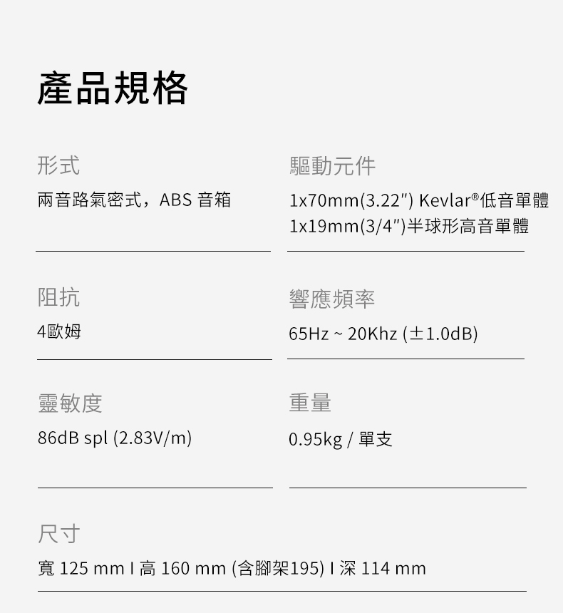 1*70mm (3.22") Kevlar低音單體 1*19mm (3/4") 半球形高音單體 |