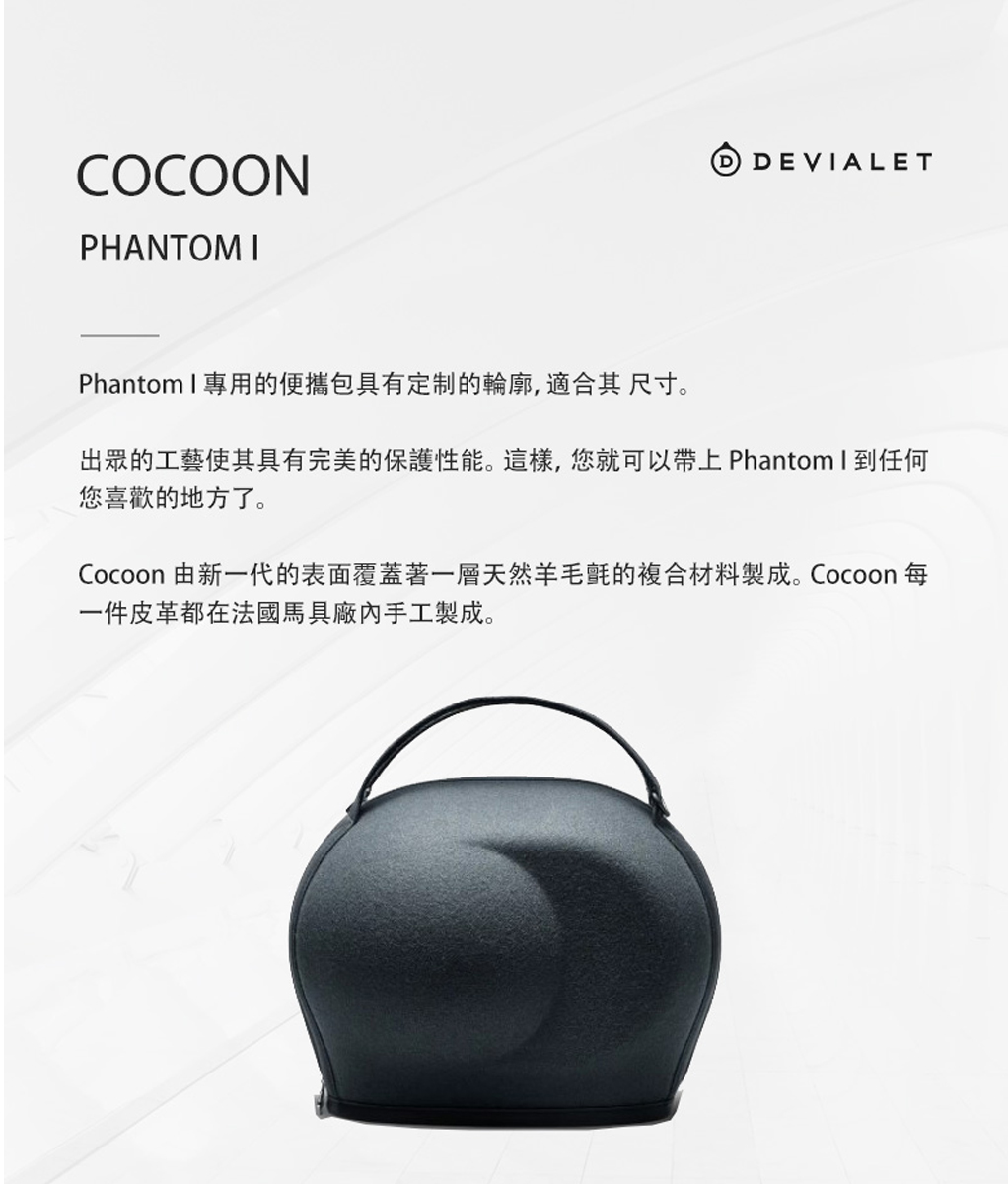 Phantom I 專用的攜行包具有定制的輪廓,出眾的工藝使其具有完美的保護性能。 您可以帶上 Phantom I 到任何您喜歡的地方, Cocoon 由新一代的表面覆蓋著一層天然羊毛氈的複合材料、每一件皮革都在法國馬具廠內手工製成。