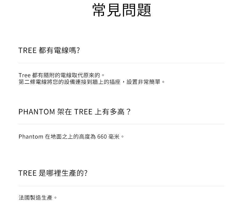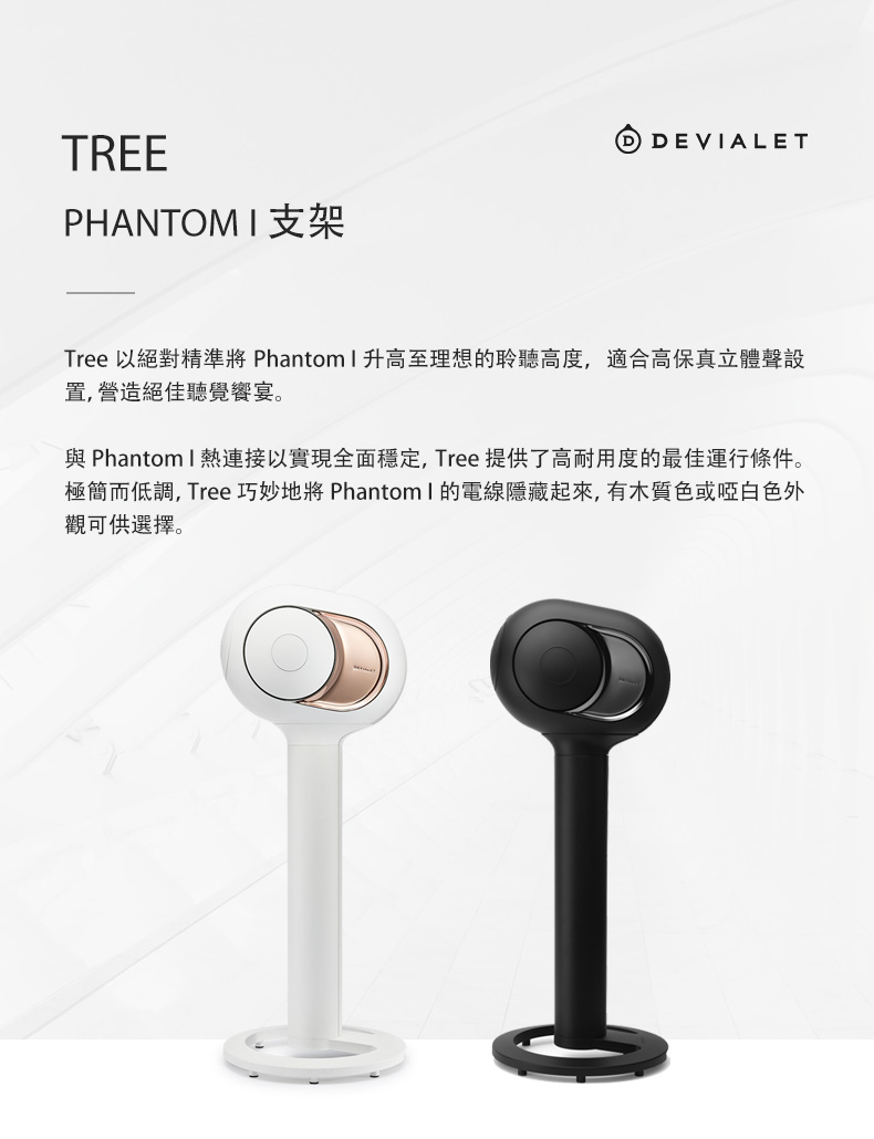 Tree 以絕對精準將 Phantom I 升高至理想的聆聽高度,適合高保真立體聲設置,營造絕佳聽覺饗宴。 與 Phantom I 熱連接以實現全面穩定,Tree 提供了高耐用度的最佳運行條件。 極簡而低調,Tree 巧妙地將 Phantom I 的電線隱藏起來,有經典白色或霧黑色外觀可供選擇。
